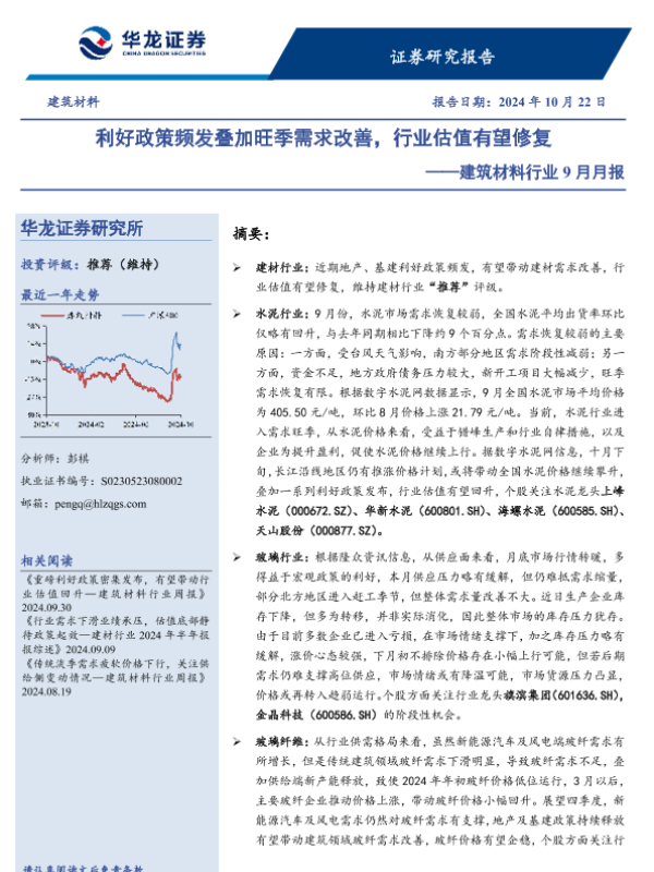 【华龙证券】【20241022】2024年10月31日更新-【华龙证券】建筑材料行业9月月报:利好政策频发叠加旺季需求改善,行业估值有望修复-15页