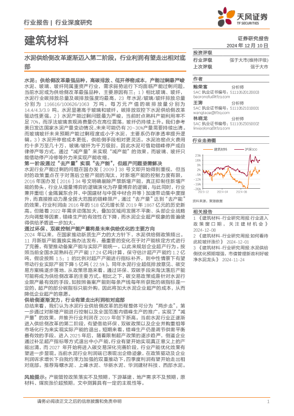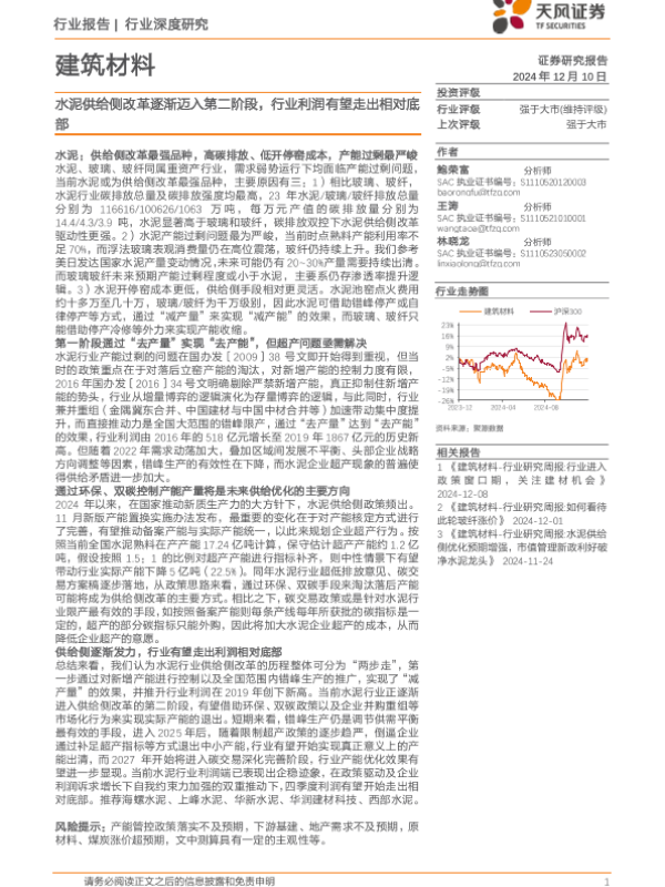 【天风证券】【20241213】建筑材料行业深度研究:水泥供给侧改革逐渐迈入第二阶段,行业利润有望走出相对底部-22页