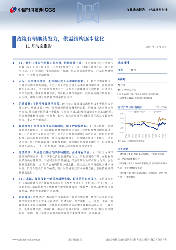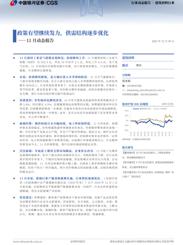 【银河证券】【20241209】2024年12月20日更新-【银河证券】建筑材料行业11月动态报告:政策有望继续发力,供需结构逐步优化-23页