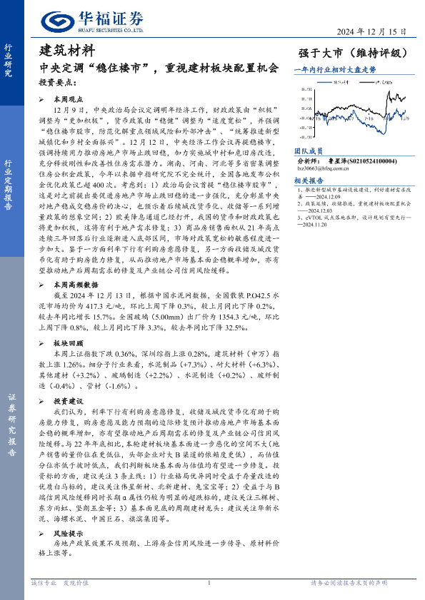 【华福证券】【20241215】2024年12月27日更新-【华福证券】建筑材料行业定期报告:中央定调“稳住楼市”,重视建材板块配置机会-11页