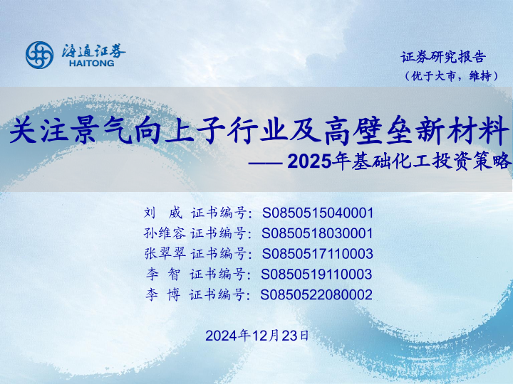 【海通证券】【20241231】2025年基础化工行业投资策略:关注景气向上子行业及高壁垒新材料-45页