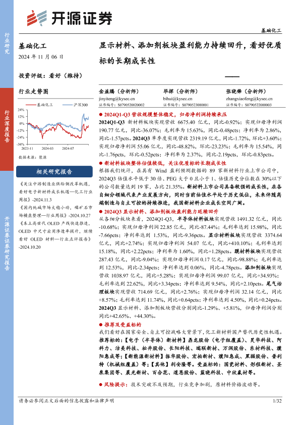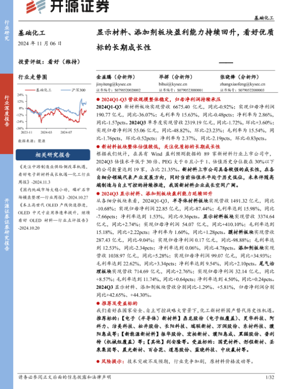 【开源证券】【20241224】2024年12月24日更新-基础化工行业深度报告:显示材料、添加剂板块盈利能力持续回升看好优质标的长期成长性-32页
