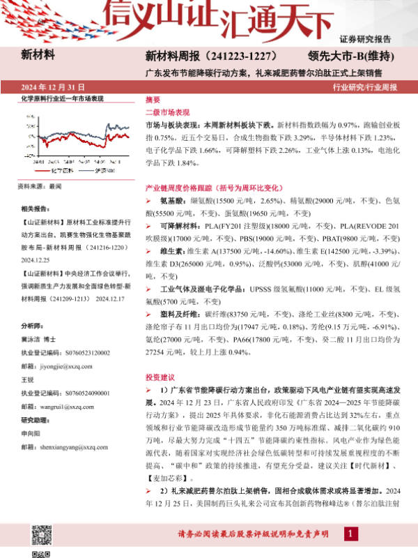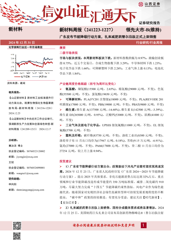 【山西证券】【20250104】新材料周报(-1227)广东发布节能降碳行动方案,礼来减肥药替尔泊肽正式上架销售-23页