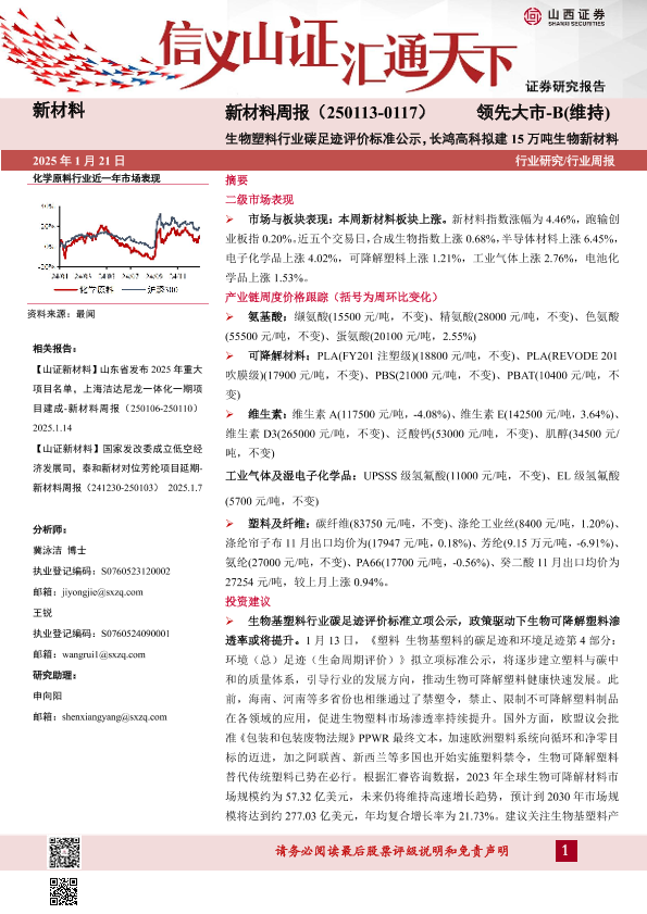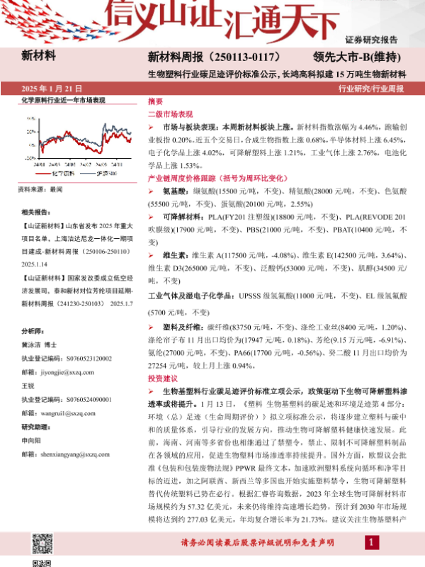 【山西证券】【20250121】新材料周报(-0117)生物塑料行业碳足迹评价标准公示,长鸿高科拟建15万吨生物新材料-23页