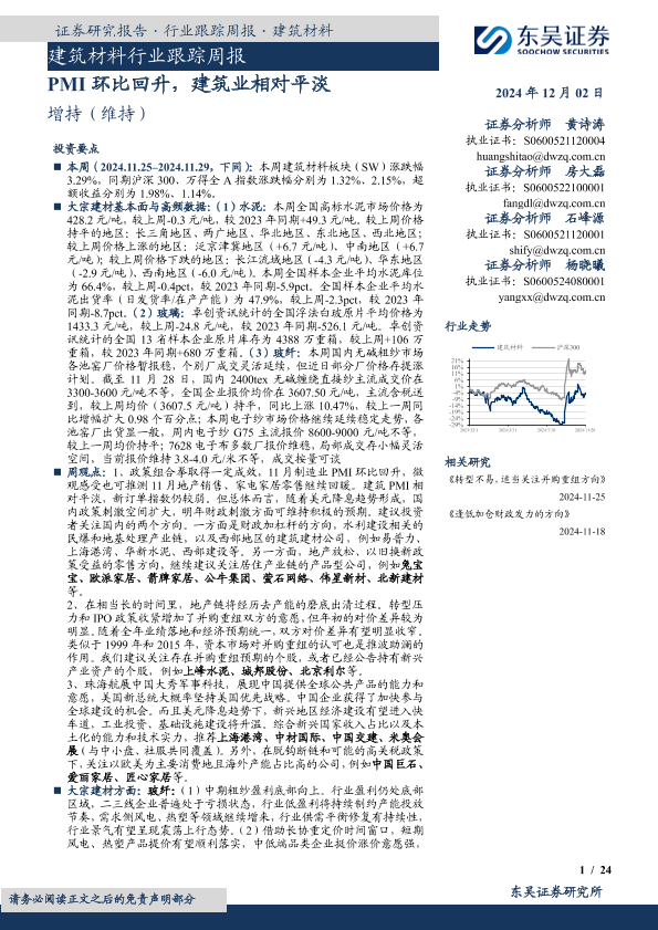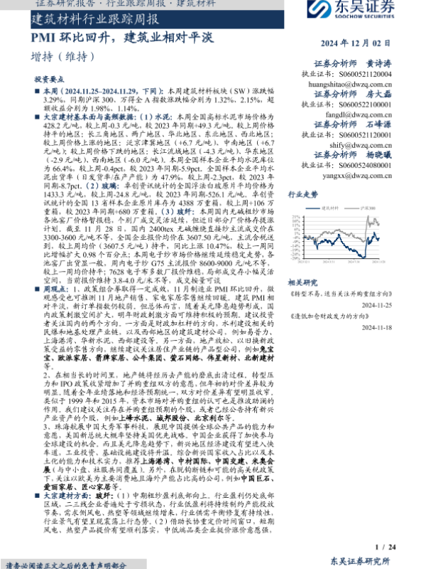 【东吴证券】【20241202】2025年02月01日更新-【东吴证券】建筑材料行业跟踪周报:PMI环比回升,建筑业相对平淡-24页