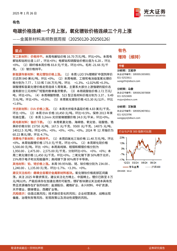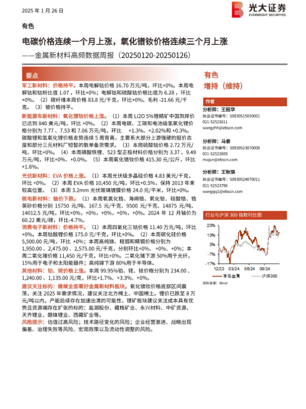 【光大证券】【20250126】金属新材料高频数据周报(-20250126):电碳价格连续一个月上涨,氧化镨钕价格连续三个月上涨-24页