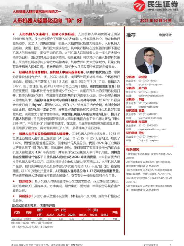 【民生证券】【20250219】人形机器人材料需求系列报告之一:人形机器人轻量化迈向“镁”好-34页
