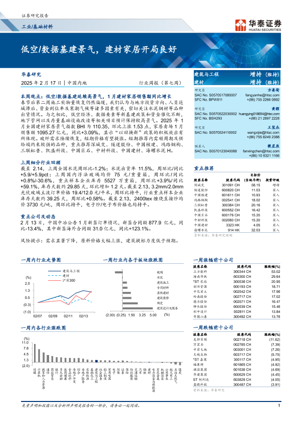 【华泰证券】【20250221】2025年02月21日更新-【华泰证券】工业基础材料行业周报(第七周):低空、数据基建景气,建材家居开局良好-15页