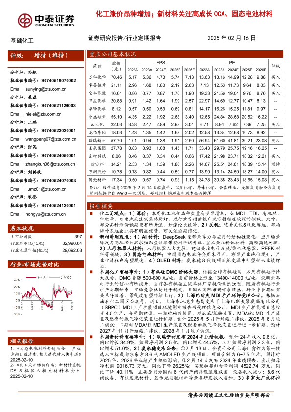 【中泰证券】【20250218】2025年02月18日更新-【中泰证券】化工涨价品种增加,新材料关注高成长OCA、固态电池材料-33页