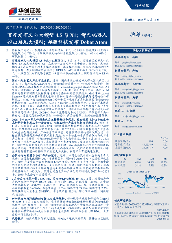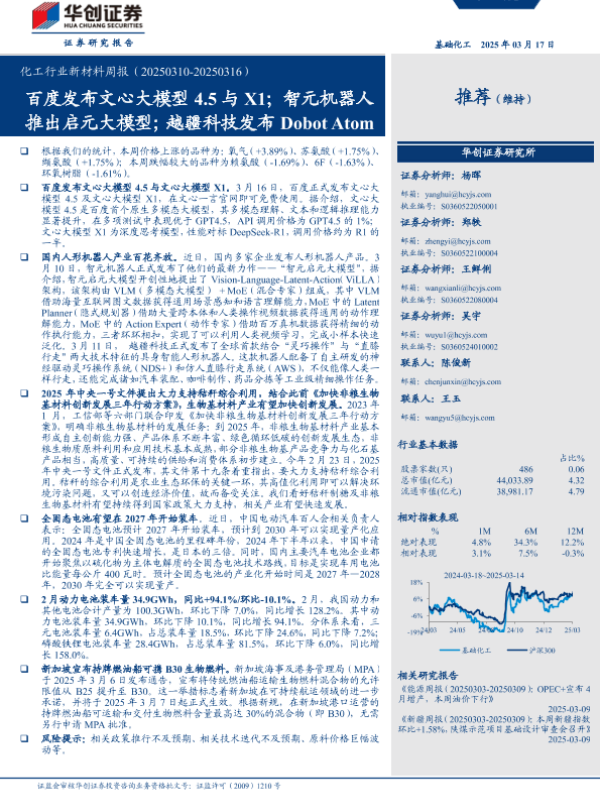 【华创证券】【20250317】8日更新-【华创证券】化工行业新材料周报(-20250316):百度发布文心大模型4.5与X1,智元机器人推出启元大模型,越疆科技发布DobotAtom-43页