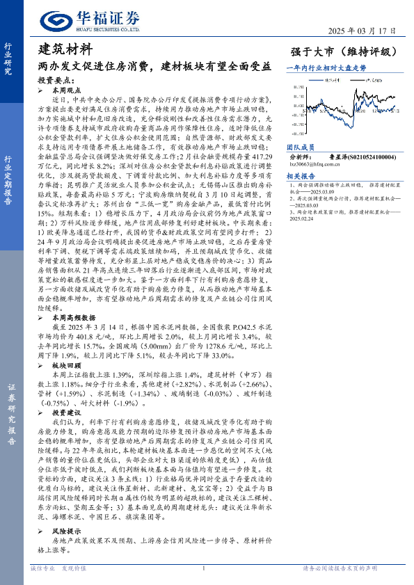 【华福证券】【20250317】建筑材料行业定期报告:两办发文促进住房消费,建材板块有望全面受益-11页