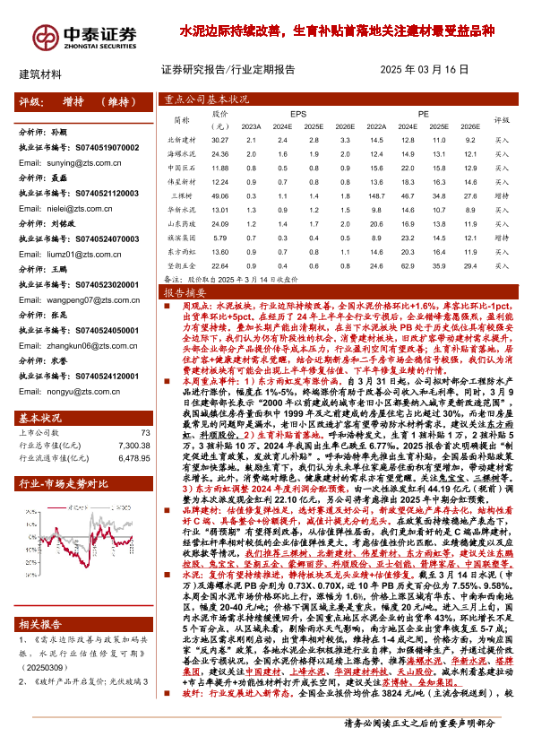 【中泰证券】【20250316】建筑材料行业:水泥边际持续改善,生育补贴首落地关注建材最受益品种-19页