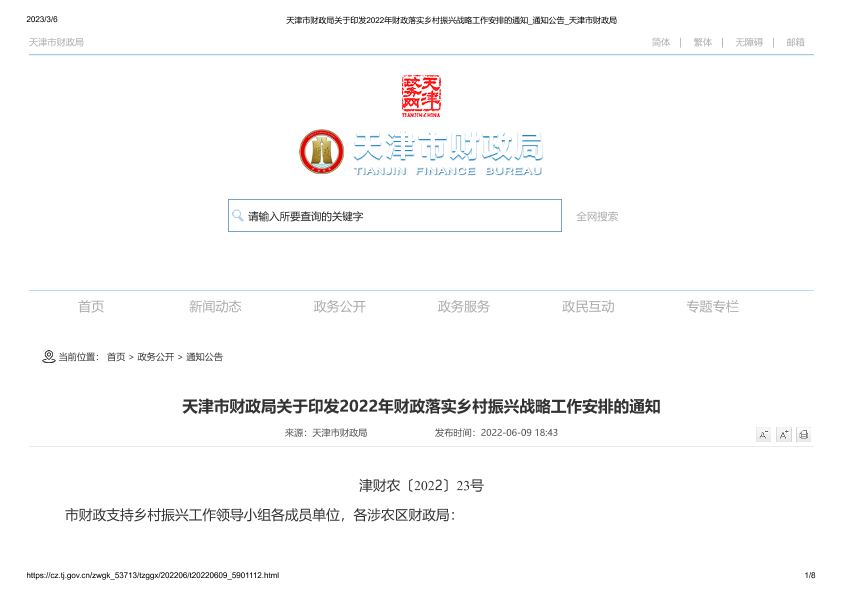 【天津市财政局】【20220609】天津市财政局关于印发2022年财政落实乡村振兴战略工作安排的通知-8页
