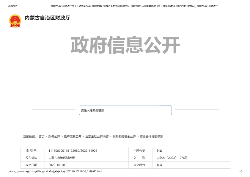 【内蒙古自治区财政厅】【20221010】内蒙古自治区财政厅关于下达2022年自治区财政衔接推进乡村振兴补助资金(乡村振兴示范旗县创建任务)预算的通知-3页