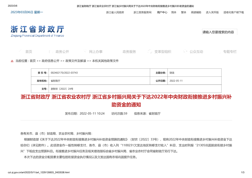 【浙江省财政厅】【20220511】浙江省财政厅浙江省农业农村厅浙江省乡村振兴局关于下达2022年中央财政衔接推进乡村振兴补助资金的通知-3页