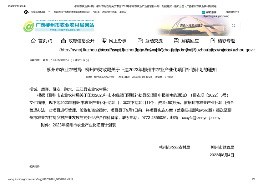 【柳州市农业农村局】【20230809】柳州市农业农村局 柳州市财政局关于下达2023年柳州市农业产业化项目补助计划的通知-2页