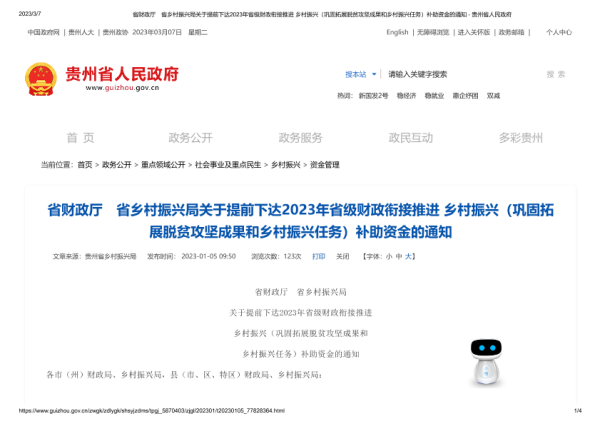 【贵州省财政厅】【20221231】省财政厅省乡村振兴局关于提前下达2023年省级财政衔接推进乡村振兴(巩固拓展脱贫攻坚成果和乡村振兴任务)补助资金的通知-4页
