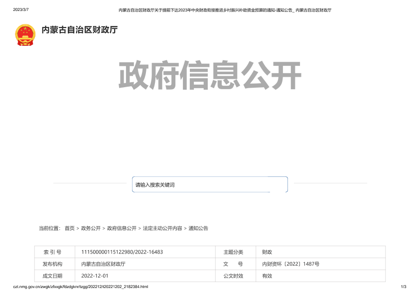 中央财政 乡村振兴 内蒙古 财政补助 预算通知