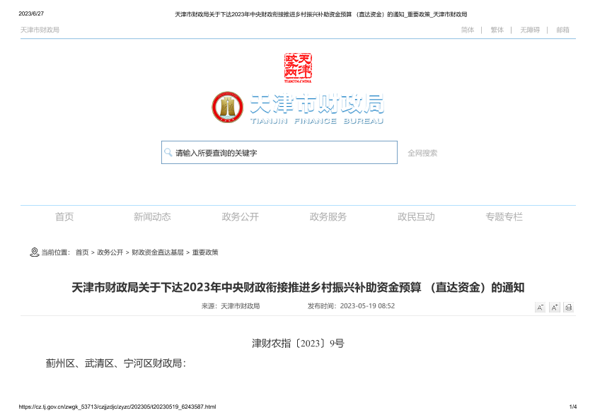 【天津市财政局】【20230519】天津市财政局关于下达2023年中央财政衔接推进乡村振兴补助资金预算 (直达资金)的通知-4页