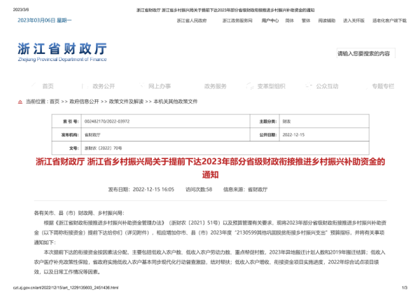 【浙江省财政厅】【20221215】浙江省财政厅 浙江省乡村振兴局关于提前下达2023年部分省级财政衔接推进乡村振兴补助资金的通知-3页