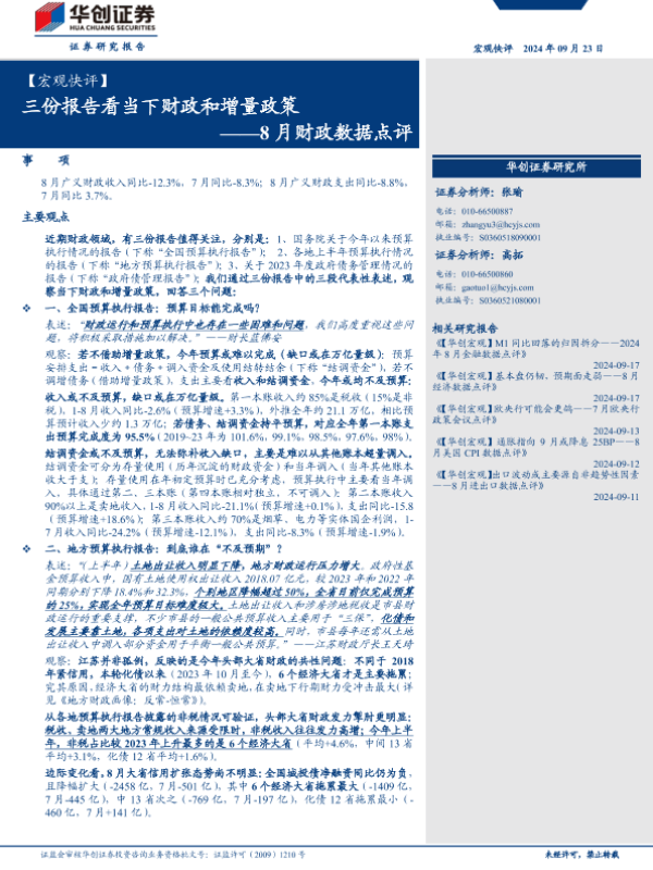 【华创证券】【20240923】【华创证券】【宏观快评】8月财政数据点评:三份报告看当下财政和增量政策-18页