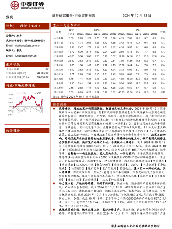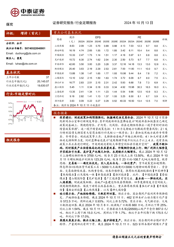 【中泰证券】【20241013】2024年10月26日更新-【中泰证券】煤炭行业:财政政策加码预期强化,把握确定性交易机会-29页