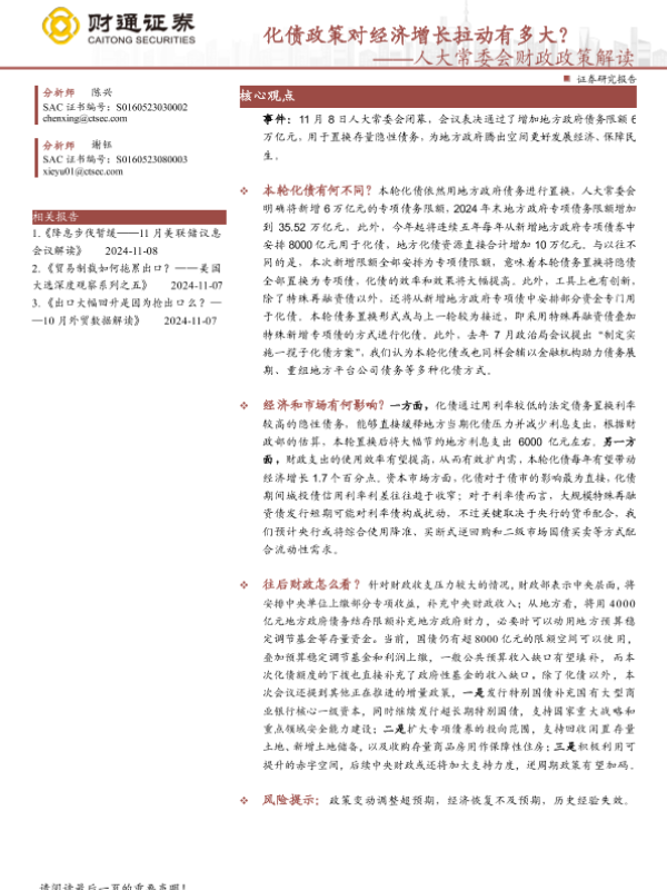 【财通证券】【20241123】人大常委会财政政策解读:化债政策对经济增长拉动有多大-10页