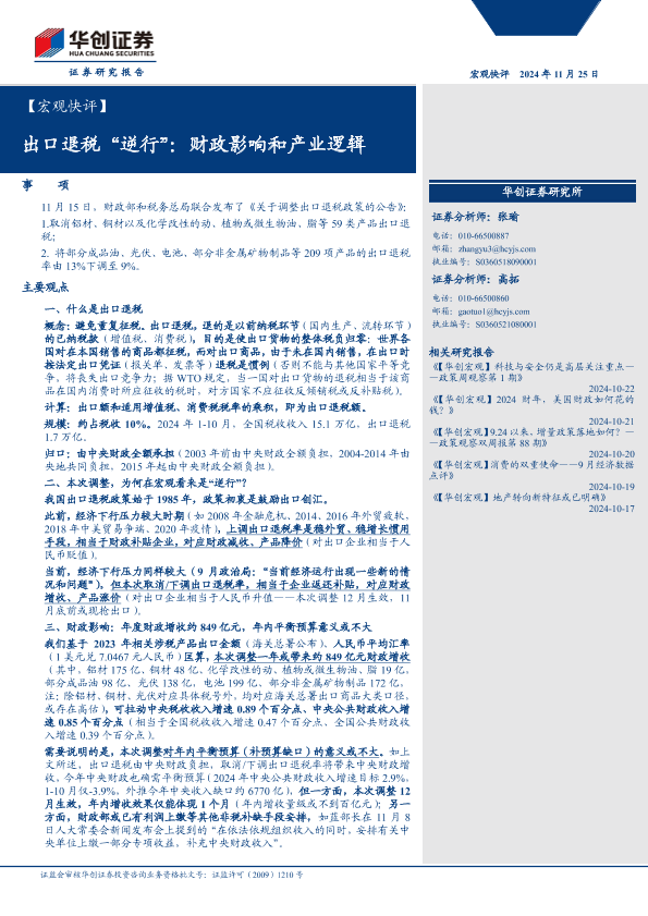 【华创证券】【20241205】【华创证券】宏观快评-出口退税“逆行”:财政影响和产业逻辑-10页