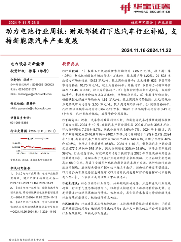 【华宝证券】【20250121】动力电池行业周报:财政部提前下达汽车行业补贴,支持新能源汽车产业发展-16页
