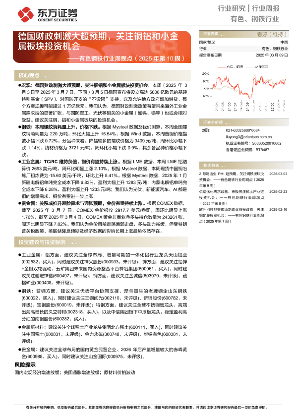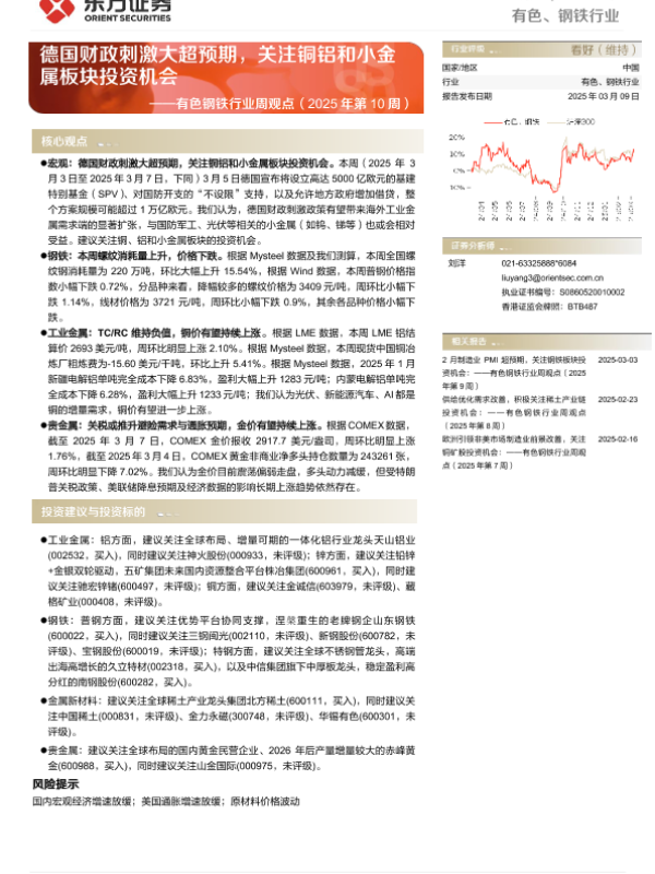 【东方证券】【20250309】有色钢铁行业周观点(2025年第10周):德国财政刺激大超预期,关注铜铝和小金属板块投资机会-26页