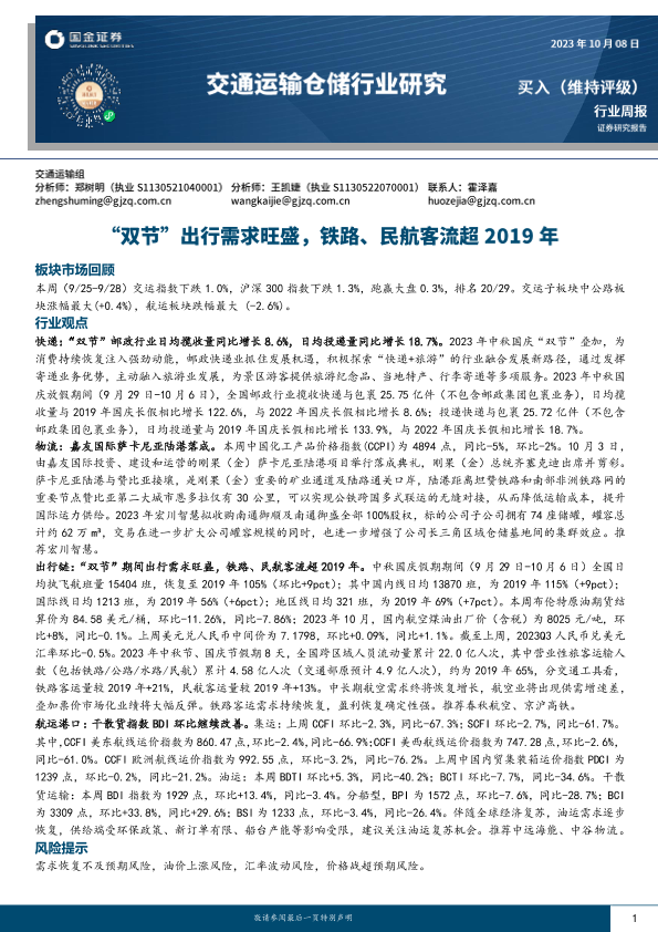 【国金证券】【20231009】2023年10月09日更新-【国金证券】交通运输仓储行业研究-“双节”出行需求旺盛-铁路、民航客流超2019年-14页