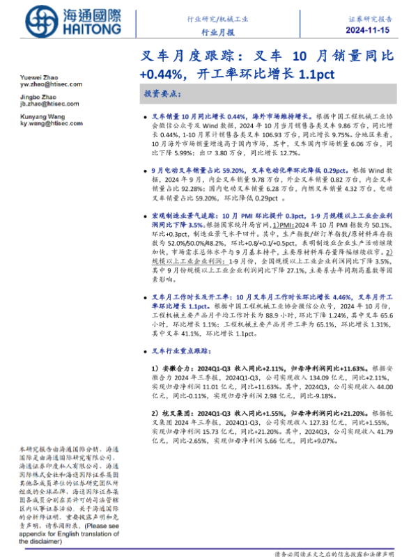 【海通国际】【20241129】机械工业叉车月度跟踪:叉车10月销量同比25,开工率环比增长1.1pct-12页