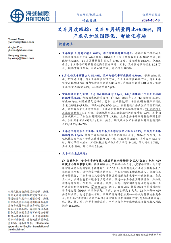 【海通国际】【20241016】2024年10月25日更新-【海通国际】机械工业行业月报:叉车月度跟踪,叉车9月销量同比25,国产龙头加速国际化、智能化布局-12页