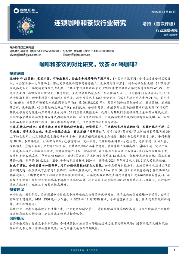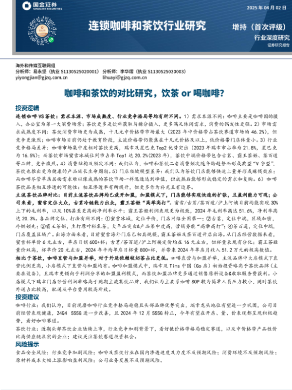 【国金证券】【20250406】连锁咖啡和茶饮行业研究:咖啡和茶饮的对比研究,饮茶or喝咖啡-23页