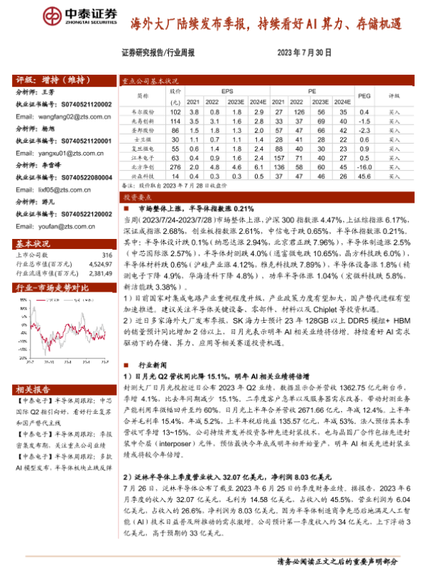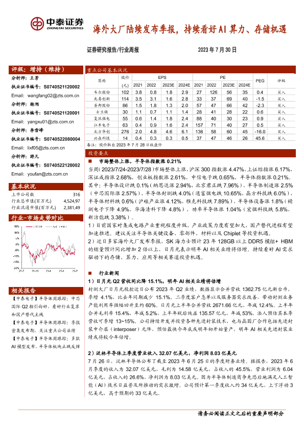 【中泰证券】【20230730】2023年11月27日更新-电子-行业周报:海外大厂陆续发布季报,持续看好AI算力、存储机遇-14页