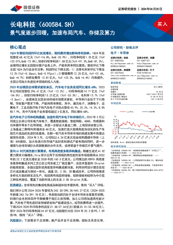 【国信证券】【20240425】2024年05月03日更新-长电科技(600584)景气度逐步回暖,加速布局汽车、存储及算力-6页