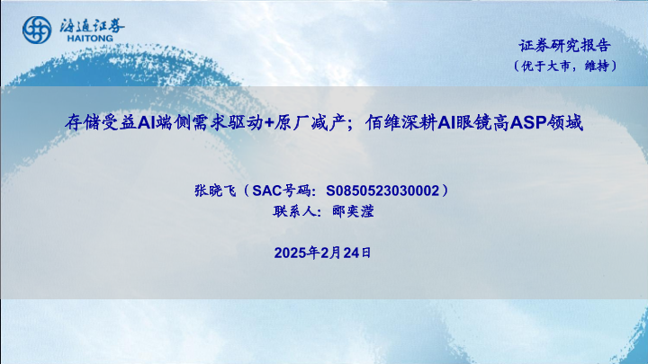 【海通证券】【20250306】存储行业:存储受益AI端侧需求驱动+原厂减产;佰维深耕AI眼镜高ASP领域-12页