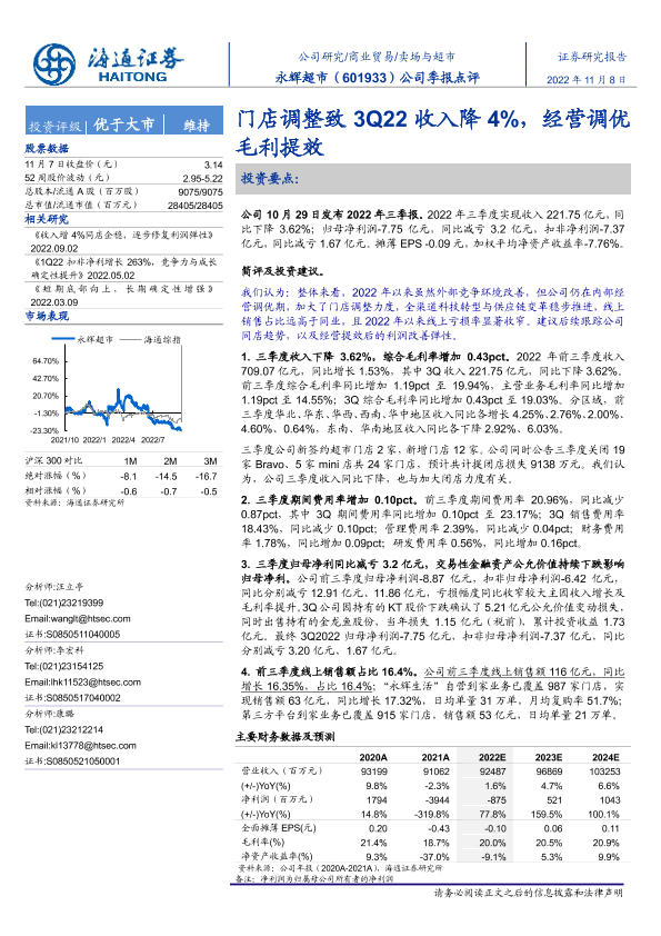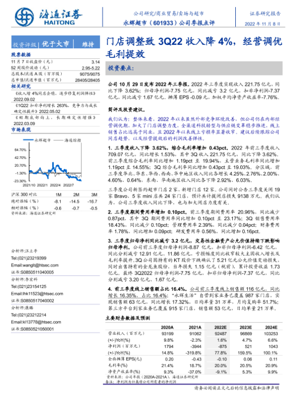 【海通证券】【20221108】2022年11月08日更新-海通证券-永辉超市-601933-公司季报点评:门店调整致3Q22收入降4%,经营调优毛利提效-5页