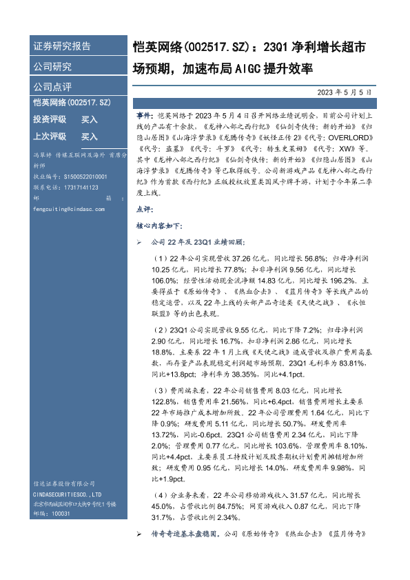 【信达证券】【20230505】恺英网络-002517-23Q1净利增长超市场预期,加速布局AIGC提升效率-7页