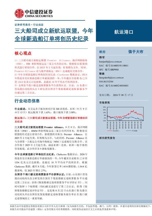 【中信建投证券】【20240917】2024年09月26日更新-【中信建投】航运港口行业:三大船司成立新航运联盟,今年全球新造船订单将创历史纪录-22页