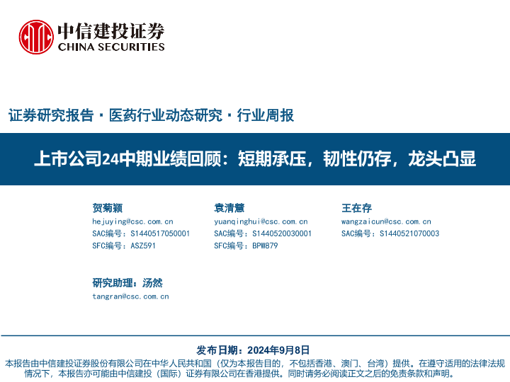 【中信建投证券】【20240908】2024年09月23日更新-【中信建投】医药行业周报-上市公司24中期业绩回顾:短期承压,韧性仍存,龙头凸显-96页