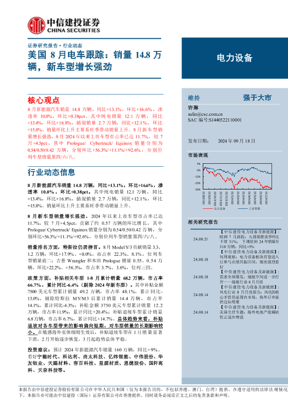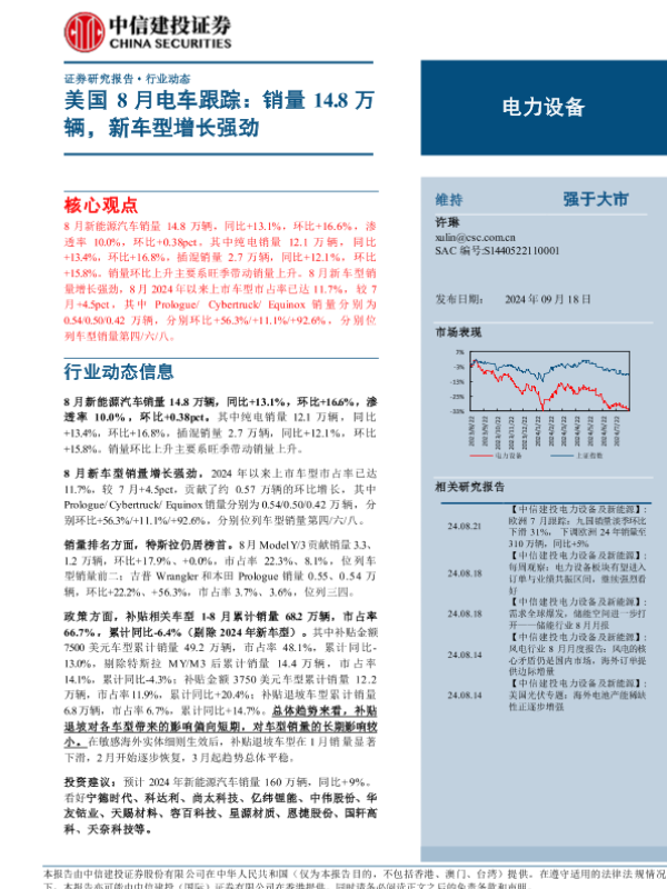 【中信建投证券】【20240918】2024年09月25日更新-【中信建投】电力设备行业美国8月电车跟踪:销量14.8万辆,新车型增长强劲-13页