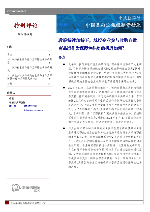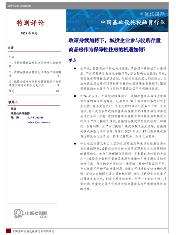 【中诚信国际】【202409】中国基础设施投融资行业:政策持续加持下城投企业参与收购存量商品房作为保障性住房的机遇如何-16页