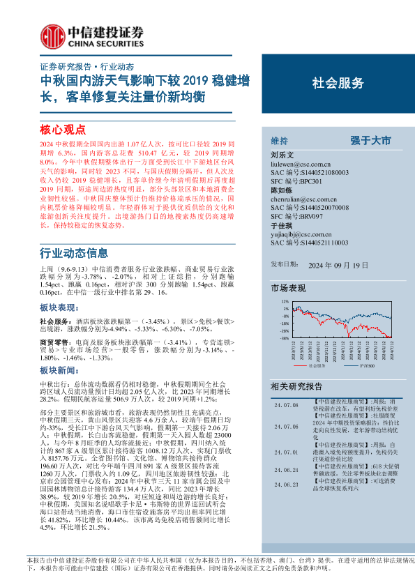 【中信建投证券】【20240919】2024年10月11日更新-【中信建投】社会服务行业:中秋国内游天气影响下较2019稳健增长,客单修复关注量价新均衡-27页