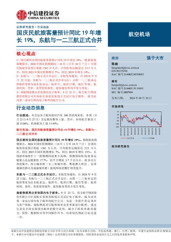 【中信建投证券】【20240930】2024年10月13日更新-【中信建投】航空机场行业:国庆民航旅客量预计同比19年增长19%,东航与一二三航正式合并-20页