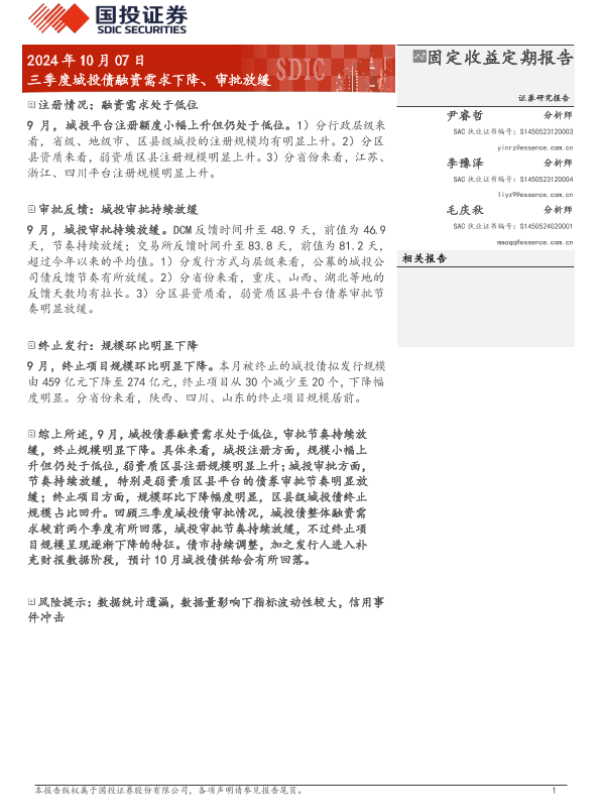 【国投证券】【20241007】2024年10月16日更新-【国投证券】固定收益定期报告:三季度城投债融资需求下降、审批放缓-11页
