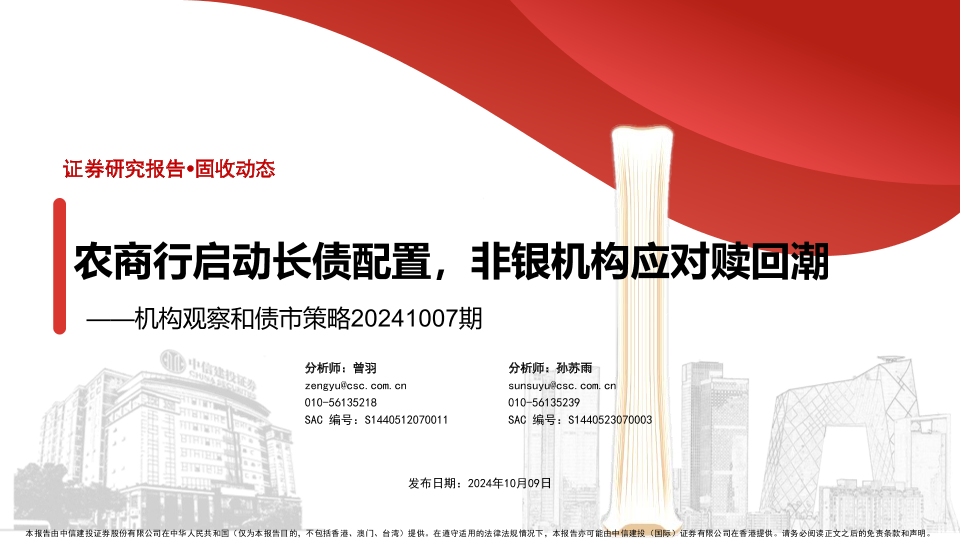 【中信建投证券】【20241009】2024年10月17日更新-【中信建投】机构观察和债市策略期:农商行启动长债配置,非银机构应对赎回潮-21页