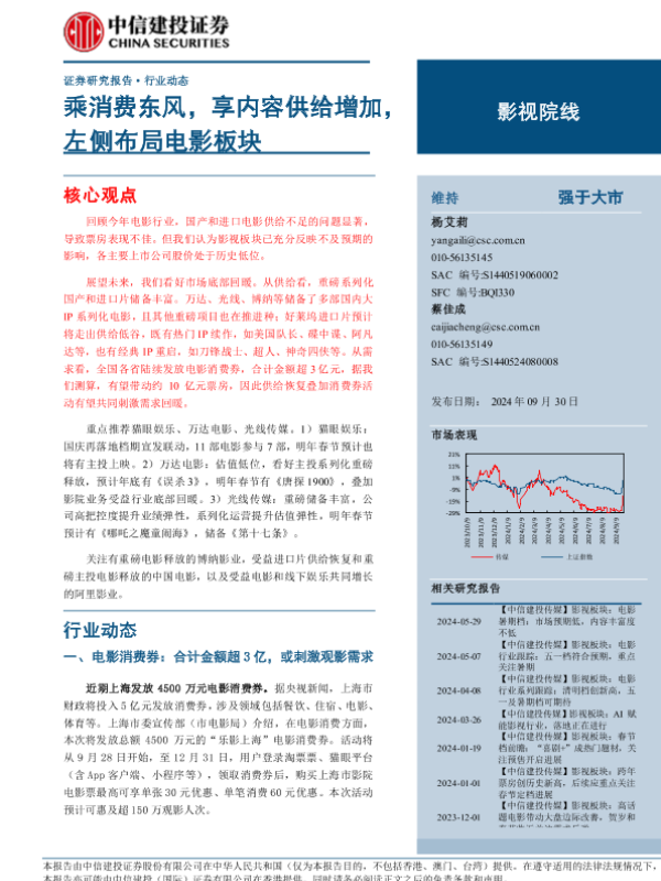 【中信建投证券】【20240930】2024年10月21日更新-【中信建投】影视院线行业动态:乘消费东风,享内容供给增加,左侧布局电影板块-20页