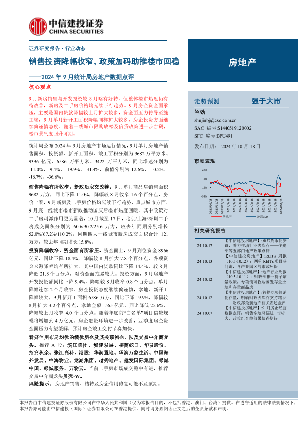 【中信建投证券】【20241029】2024年9月统计局房地产行业数据点评:销售投资降幅收窄,政策加码助推楼市回稳-10页