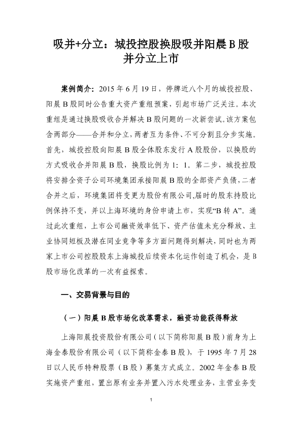 B股改革 分立上市 城投控股 换股吸收合并 资产重组